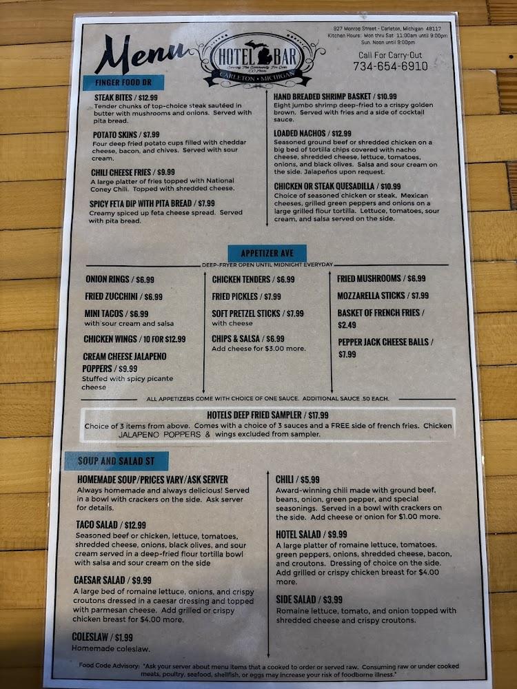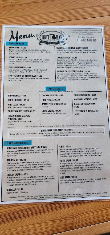 The menu at Carleton Hotel Bar features a delightful mix of traditional and contemporary dishes. Start with appetizers like crispy onion rings or spicy feta dip. These shareable plates are perfect for a casual bite with friends.