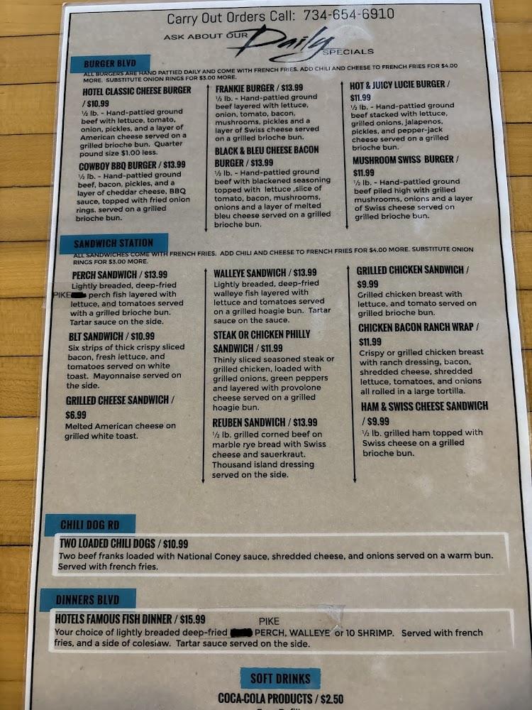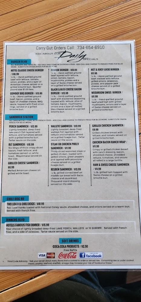 Burgers are a highlight here, with options like the Hotel Classic Cheese Burger and Frankie Burger. Each burger comes with fries, ensuring a filling meal. Sandwich lovers can enjoy choices like the Walleye Sandwich or a grilled cheese.